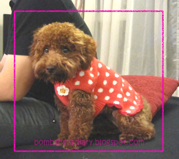 Last month, Elaine's brother went to Taiwan and got her this cute li'l sweater. It's hand knitted and it even has a brooch!